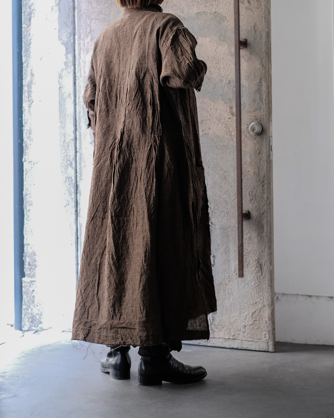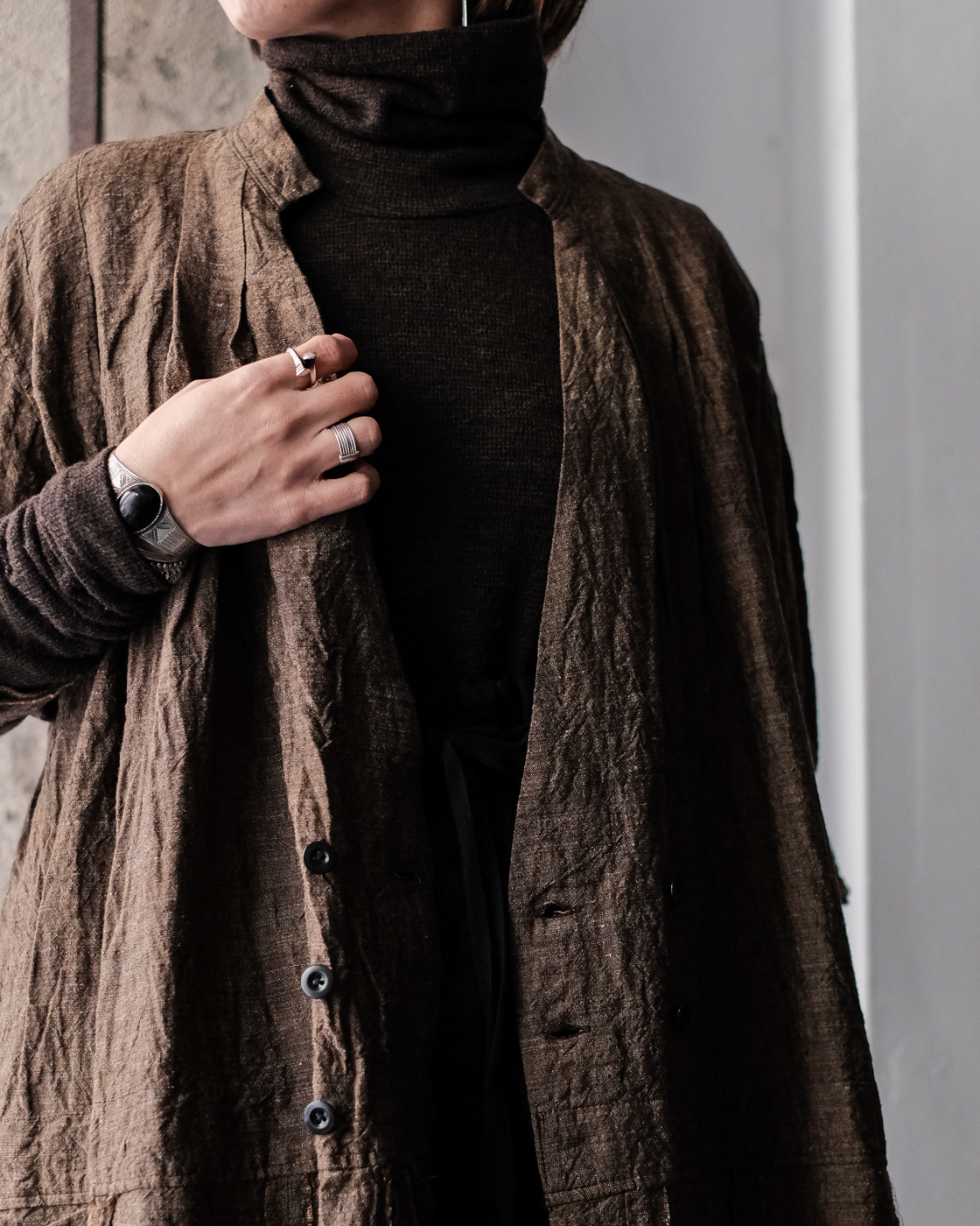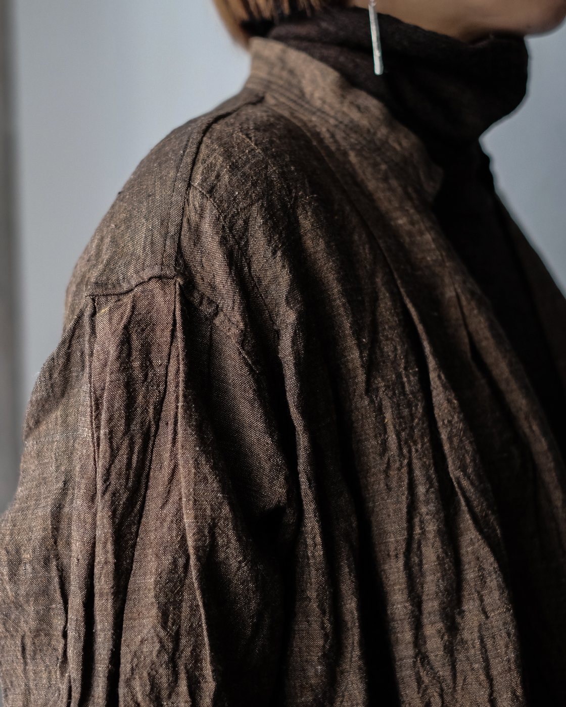 太番手糸をあまり詰めずにゆっくりと時間をかけて織り上げ、空気をはらんだ軽やかに仕上げた一着。