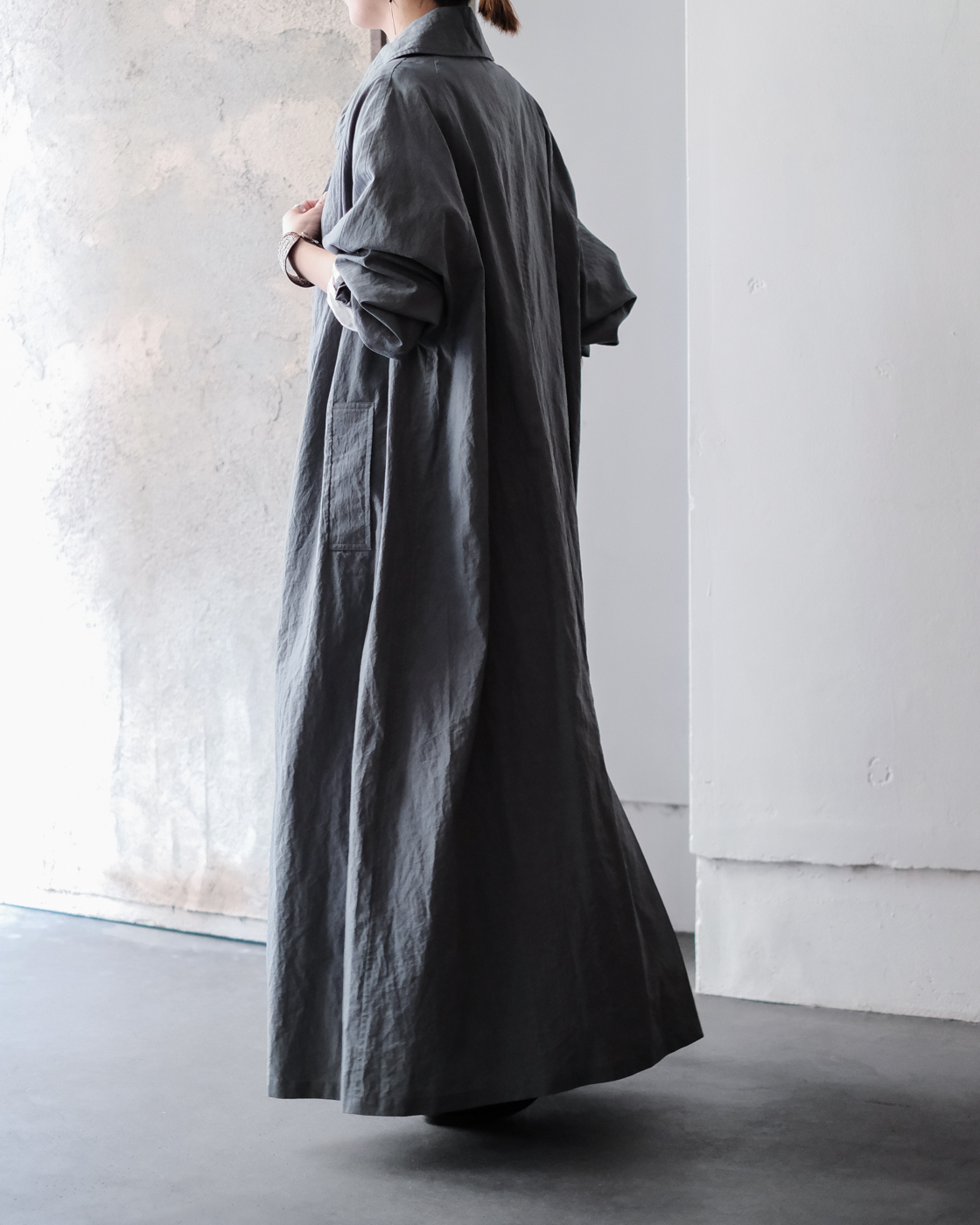 体をすっぽりと包み込むロング丈の着丈バランスに、首に沿う綺麗な襟元、縦に落ちるシルエットが体のラインを縦長にすっきりと見せてくれます。