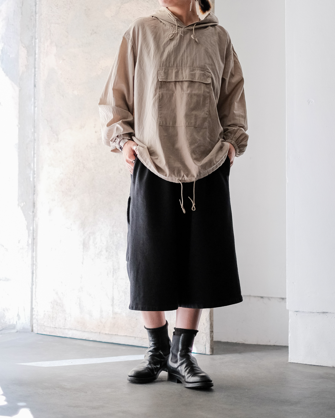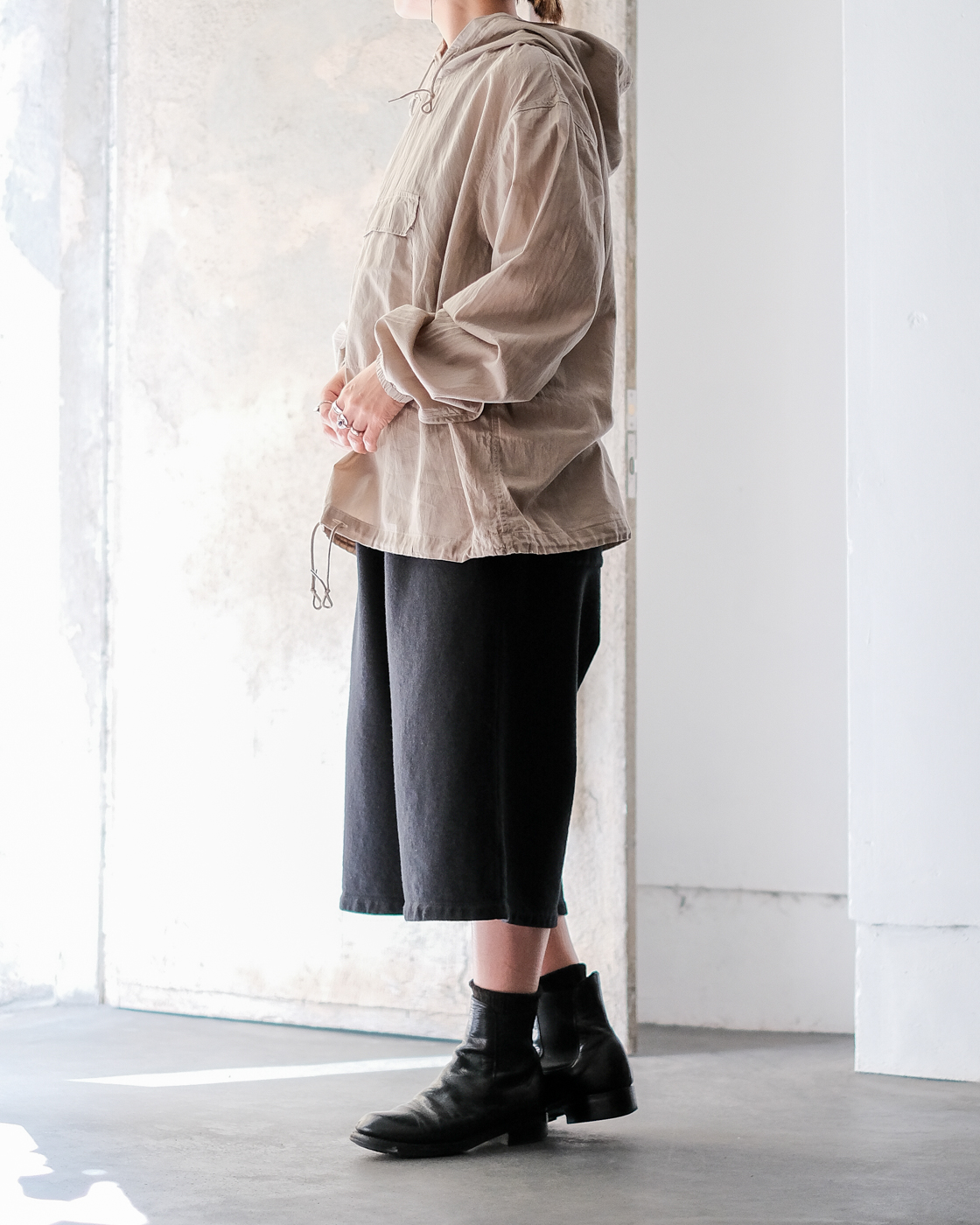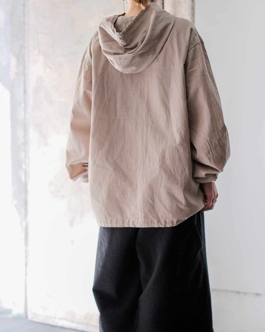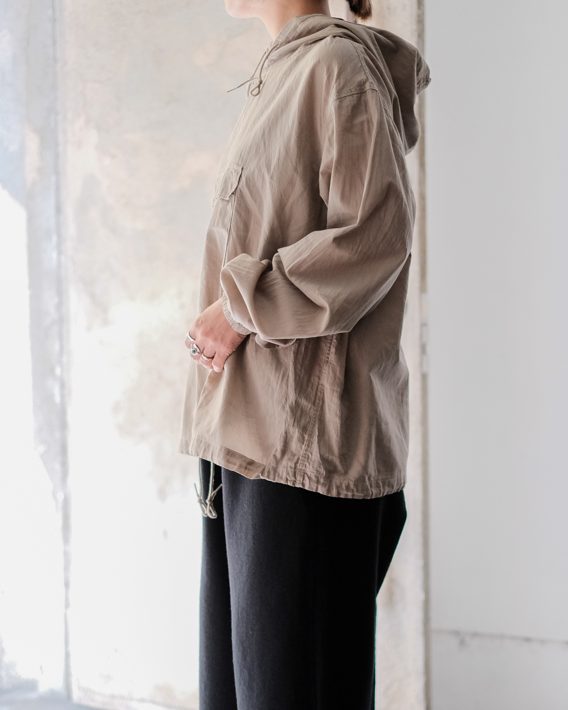 ミリタリー、アウトドアのアノラックパーカーの空気をしっかりと残しつつもPHIGVELらしく上品さが。